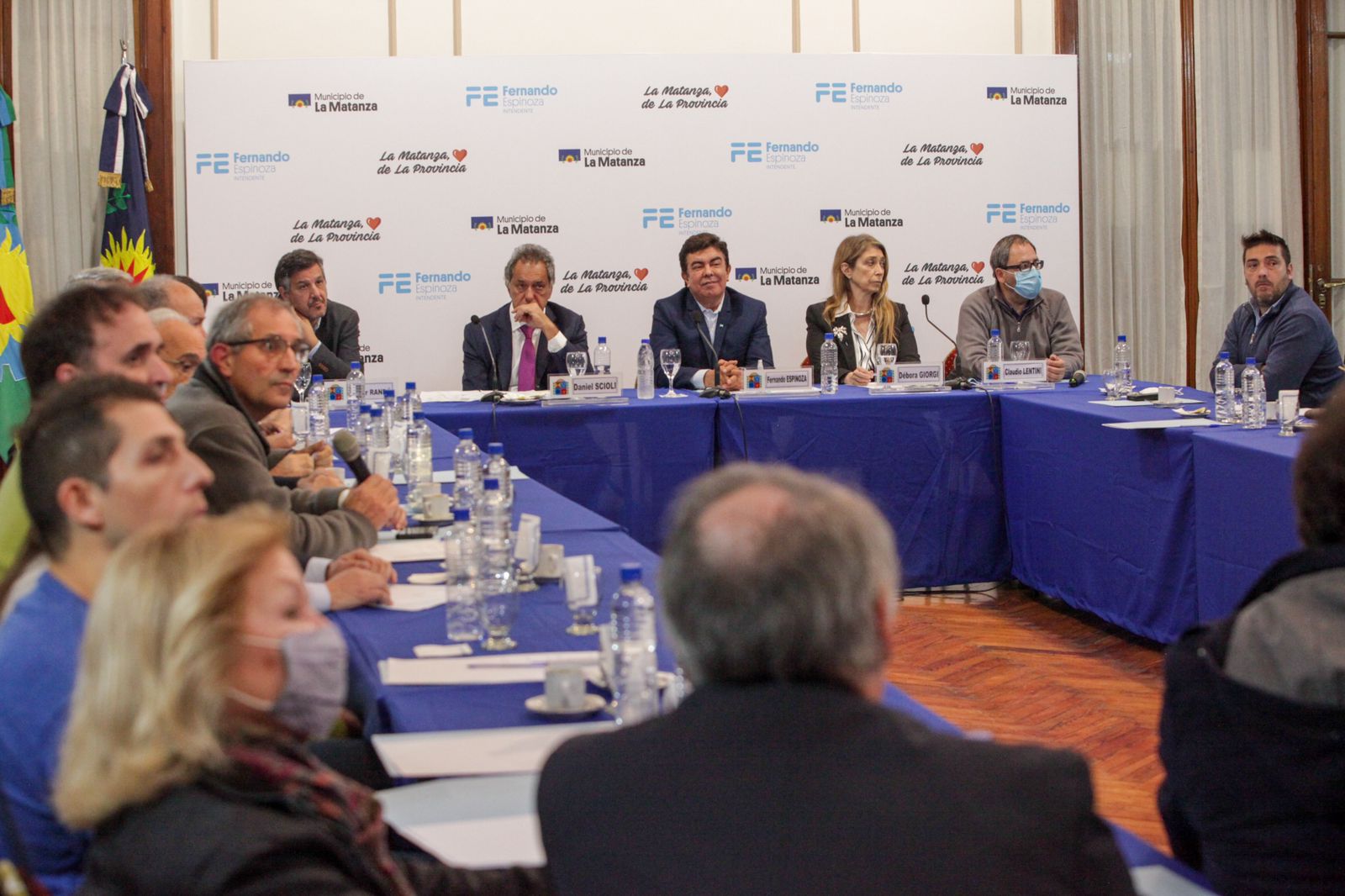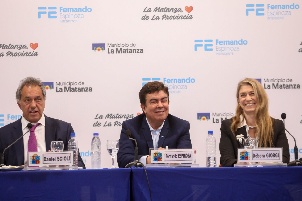 El intendente de La Matanza, Fernando Espinoza, junto al embajador de la Argentina en Brasil, Daniel Scioli, y la secretaria de Producción del municipio, Débora Giorgi, presentaron ante empresarios locales la Misión Comercial que se llevará a cabo en San Pablo, Brasil, los días 29 y 30 de mayo.