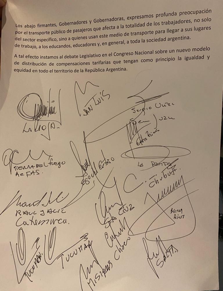 La presentación del proyecto en el Senado Nacional fue coincidente con la firma de un documento, en el CFI, en el que los 16 mandatarios expresaron “profunda preocupación por el transporte público de pasajeros que afecta a la totalidad de los trabajadores, no solo del sector específico, sino a quienes usan este medio transporte para llegar a sus lugares de trabajo, a los educandos, educadores, en general a toda la sociedad”.