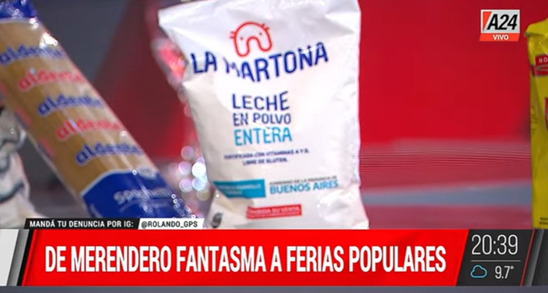 “Se venden en ferias populares y hasta por internet”, asegura. Entre los productos hay leche de la marca La Martona con carteles que dicen que está prohibida su venta, fideos Aldente, y otros alimentos cuya comercialización tampoco está permitida.