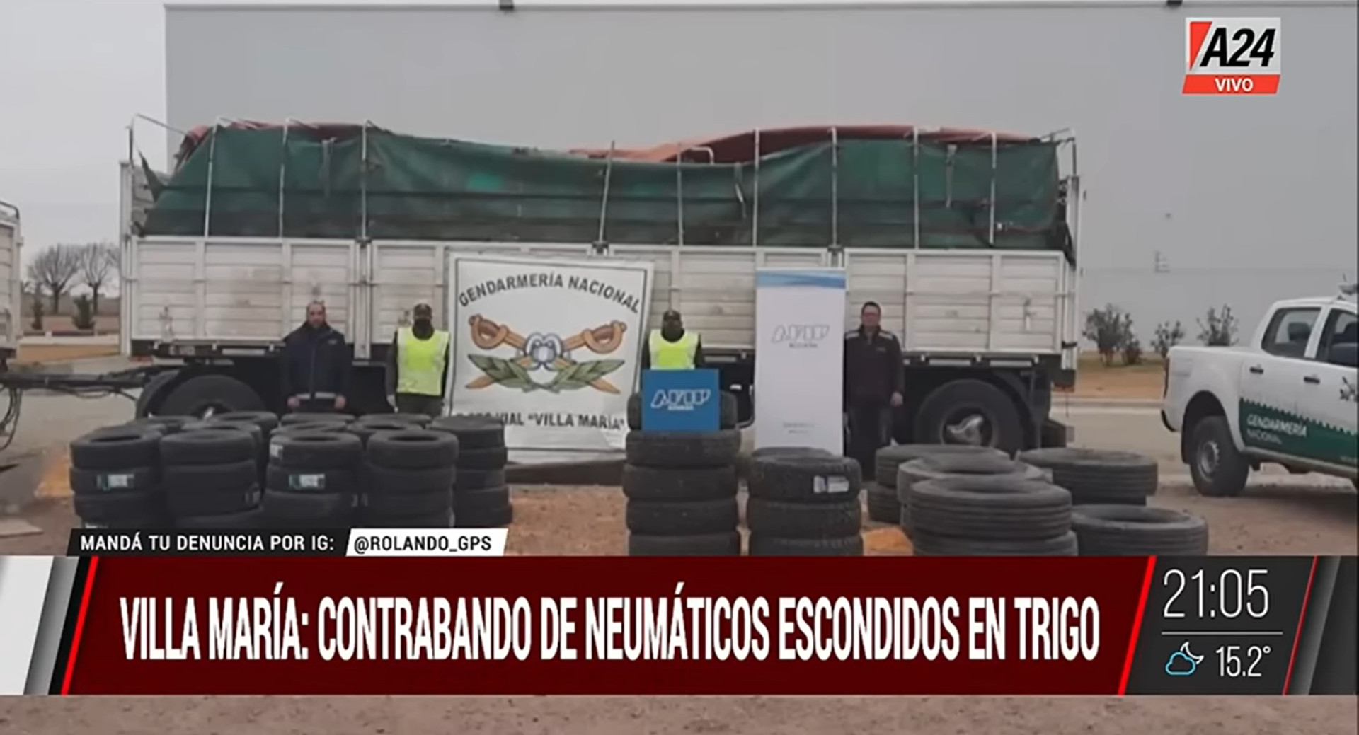 Según reveló el programa GPS que conduce Rolando Graña, 117 neumáticos de origen extranjero estaban ocultos dentro de un camión que transportaba trigo que circulaba por la ruta 158.